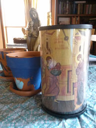 In the icon of the feast, the archangel Gabriel approaches the Theotokos as if he is running to bring her the joyful news - she has been chosen to be the Mother of God. He reaches out in greeting to hail her, Full of Grace. The Theotokos is seated on a raised throne, reminding us that she is “greater in honor than the cherubim, and beyond compare more glorious than the seraphim, who without corruption gave birth to God the Word.” She holds in her left hand the spindle of yarn which she used to do her job at the Temple, weaving the veil for the Temple in Jerusalem. She raises her right hand in acceptance. Mary is always shown in iconography with three stars - on her two shoulders and her head - to symbolize her virginity before, during, and after the birth of Christ.